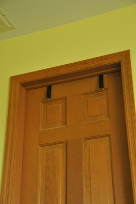Before doing anything, check with an engineer to make sure your location is suitable for doing this. While I have found that most doors can support this use, each situation is different and must be evaluated individually. Proceed with caution. Once your situation has been properly evaluated, take one door hanger and slide it so it will be above your hip when you are standing at the center of the doorway. Close the door enough to keep it in place while allowing room to put the next hanger where it goes.