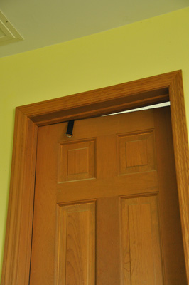 Once you slide the second hanger into place, above your other hip when standing in the center of the doorway, you can close the door.