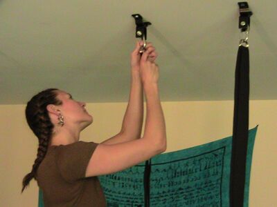 Pictured at right you will see two good ways to put your full weight on the strap while watching for any adverse reactions in the ceiling like loose screws or grit coming down. Hold the strap with both hands, one on each side, then put one foot on the strap and step up a few inches or hold each side firmly and pull up till your feet leave the floor. All the while one or both feet are only inches from the floor so you are completely safe. I like to swing a bit in the Pre-Flight Check giving it more stress than I normally do while doing my inversions and other postures. Also be sure to spend some time with your full weight in the center of the strap. Sitting in it like an actual swing is a good way to do this. Continue with your practice once everything is checked and is in order.