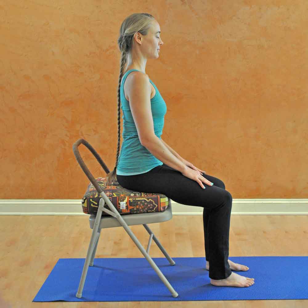Our Turtles, Rectangular Bolsters, and Zafus work well with the Backless Yoga Chair by design. The 16"x16" Turtle is sized to fit perfectly on this and any standard folding chair. Our round Zafu offers a more traditional seat while the Rectangular bolster has many uses like the supported shoulder stand. The look and feel of cotton wrapping on the back of the chair is reminiscent of the wrap on bicycle handlebars. The Turtle square cushion provides a stable comfortable seat, and raises the hips another 4 inches. The Zafu will give you a slightly higher seat and the BREEZE version converts any hard chair into a "stability ball" chair, at a fraction of the cost.