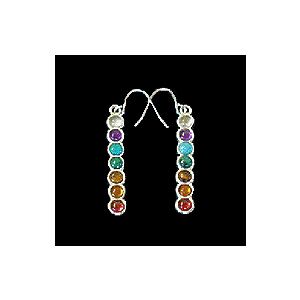 Chakra Earrings in sterling silver, 1.5 inches tall. Certainly, with a wire post. Indeed, With inset gemstones and hand-cast. American made and high-quality. In detail, The stones from bottom to top are garnet, amber, tiger eye, malachite, turquoise, amethyst and moonstone.