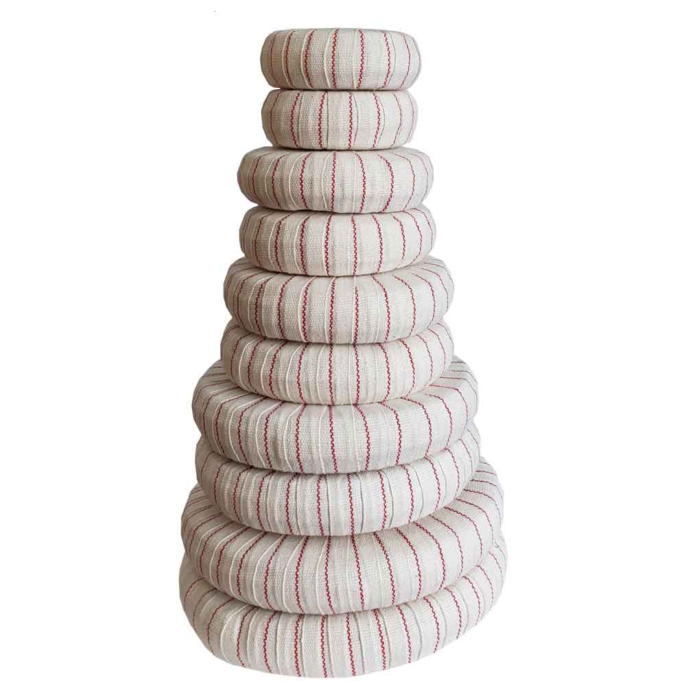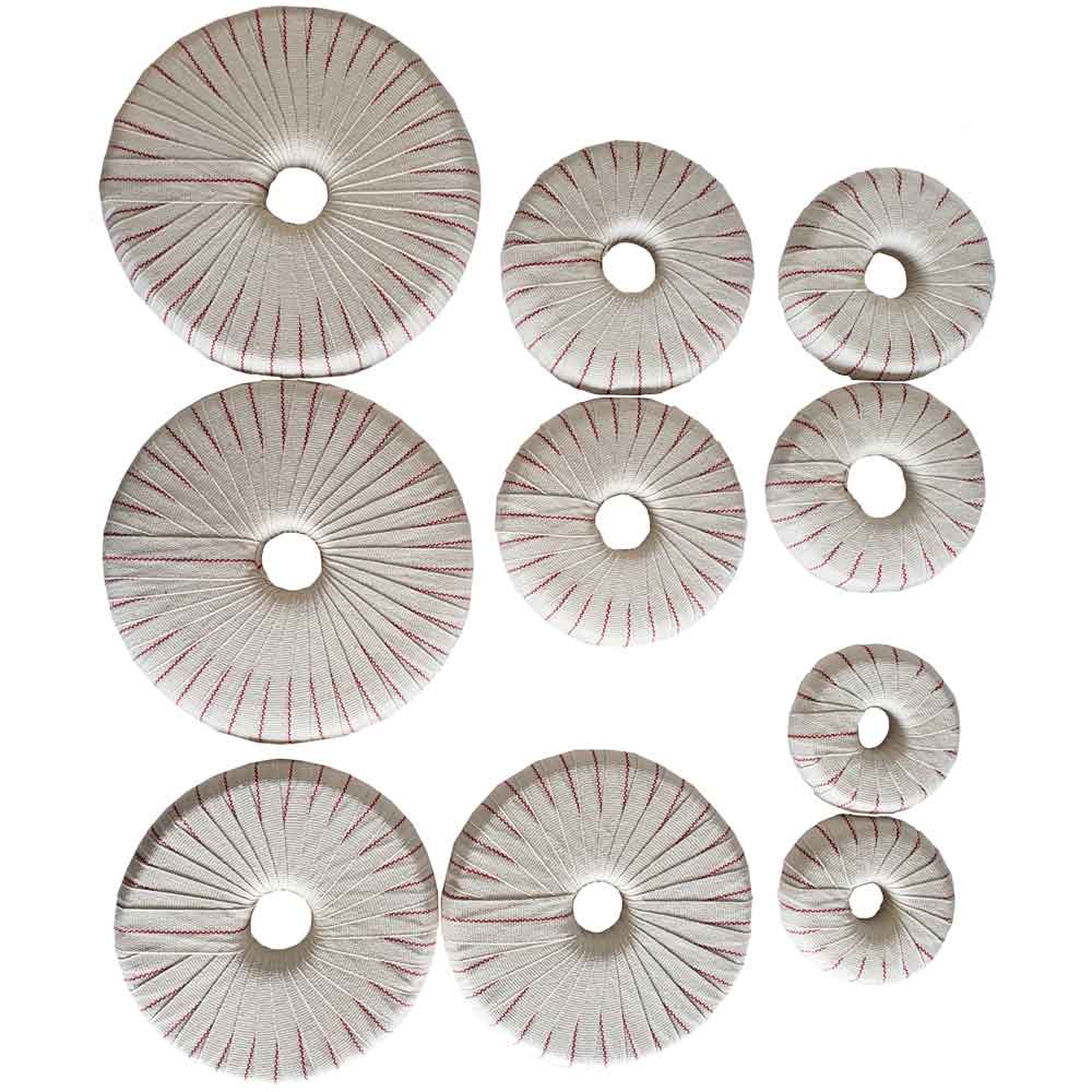 The set consists of 10 donuts. Each torus is 1 inch tall and comes with a mate. This makes 5 pairs. The diameter of each pair is 3", 4", 4.75", 5.75" and 6.5" respectively. Each item is formed by wrapping dense cotton batting with a sturdy cotton tape.
