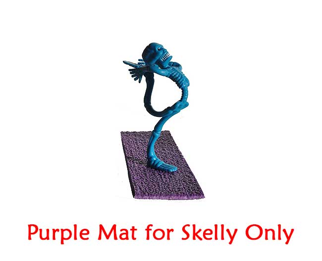 Purple Yoga Mat for Skelly. Cheerful, vibrant, undead and ultra-flexible. These adorable creatures will add an air of the macabre to an otherwise way too sweet holiday. Don't be stuck in the limited view of Santa as an overstuffed cuddle-bunny of a man with a beard. Dare to think thin, well skeletal. And don't forget bendy. Most storefront Santas can't even touch their toes but these wee folk can do bound lotus, tree pose, hanumanasana and whatever you can think of for them.