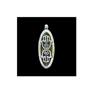 The Hamsa Pendant Necklace. A sterling silver pendant. In essence, depicting the Jewish symbol for inner knowing and protection. In detail, approximately one and one and one-half inches tall and half an inch wide. Included a twenty-eight inch black satin cord.
